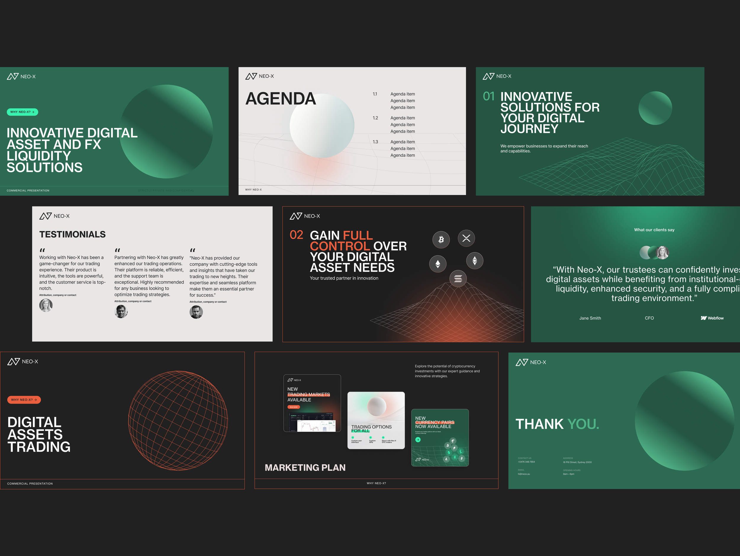 The rebrand extended to PowerPoint templates, email designs, social media banners, and printed assets, ensuring consistency across all platforms and touchpoints. The result was a unified, professional identity tailored for Neo-X’s expanded audience.