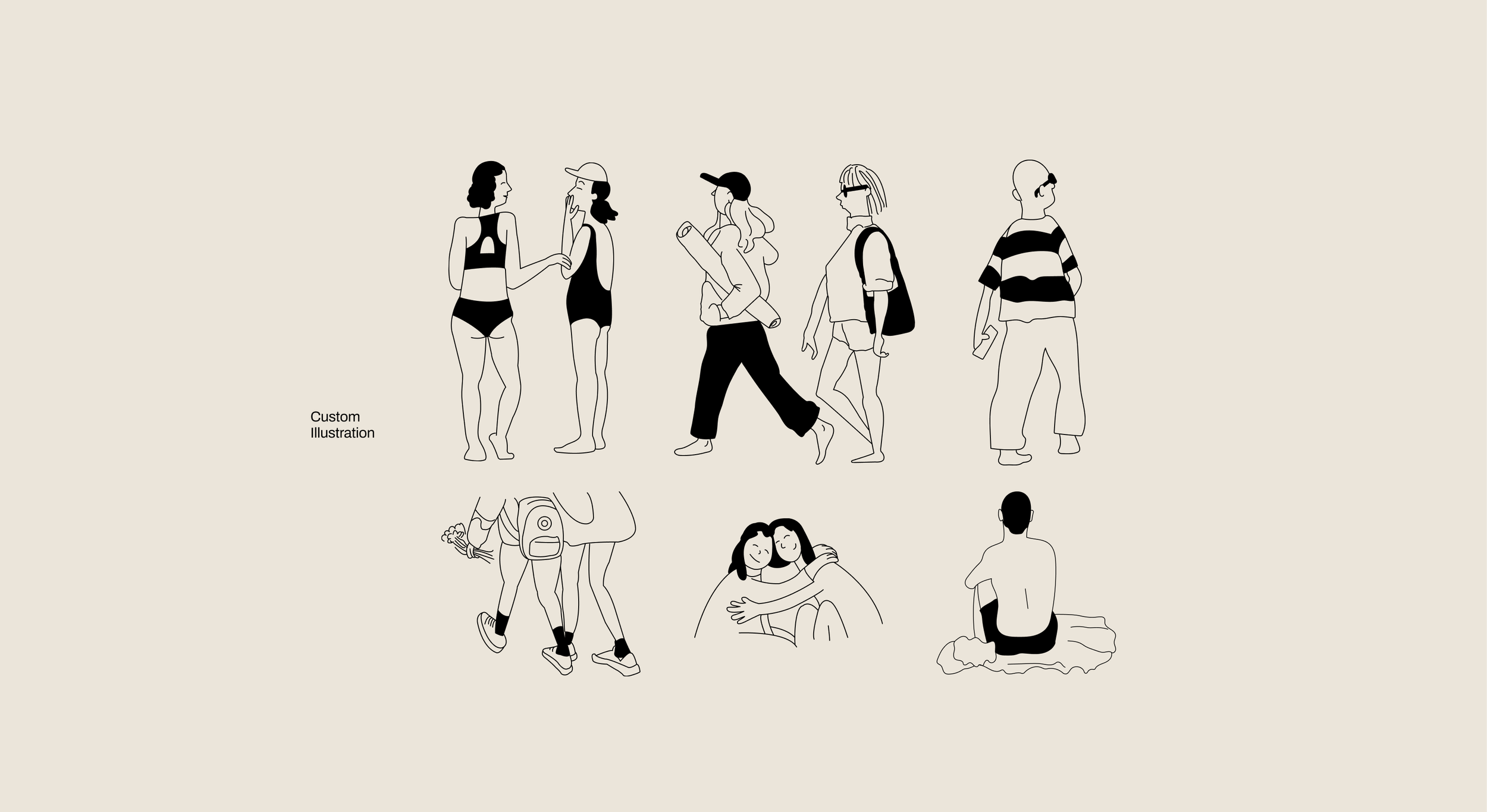 For the brand identity, I created a set of illustrations portraying everyday moments with a warm and inviting charm. The logo uses a chunky typeface, chosen to create an interesting contrast with the delicate, fine-line illustrations. In applications, I aimed to highlight the characters, following a simpler but impactful design approach.